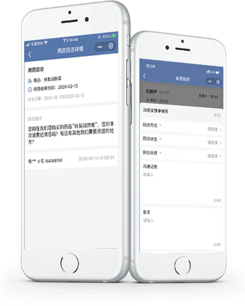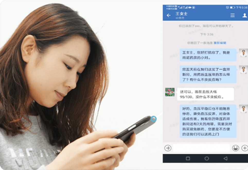 用药提醒、复购回访、营销回访,通过推荐话术、顾客标签等功能,打通企业微信进行一对一、社群、顾客朋友圈等多形式的精准触达